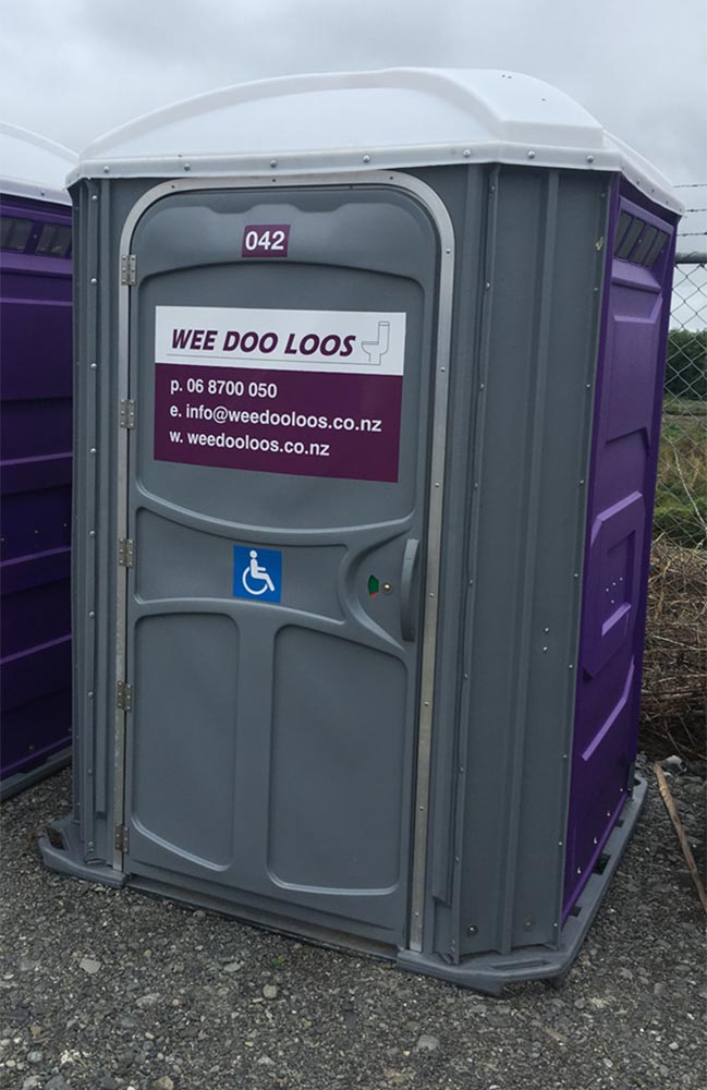 With this sleek neutral grey/purple exterior, this handicap unit has ground level access with convenient grab bars.